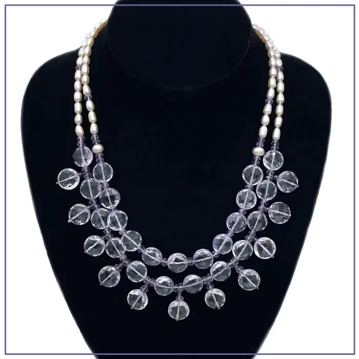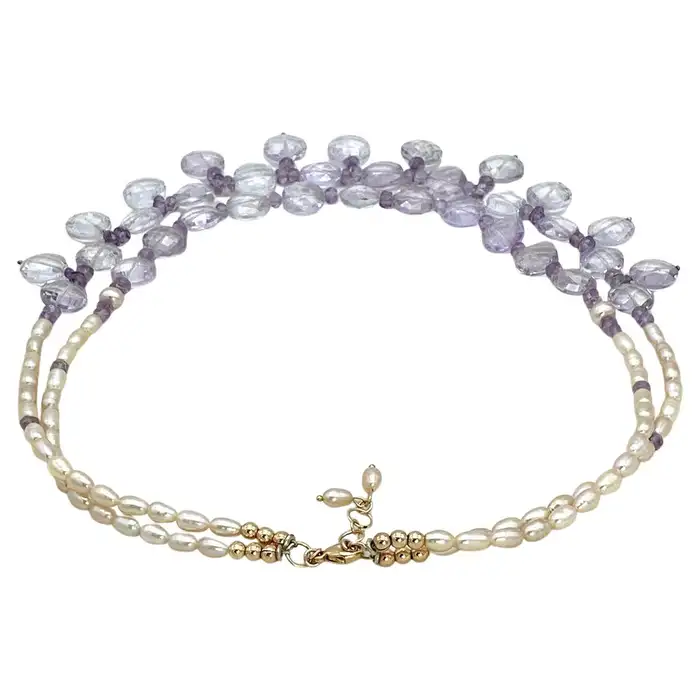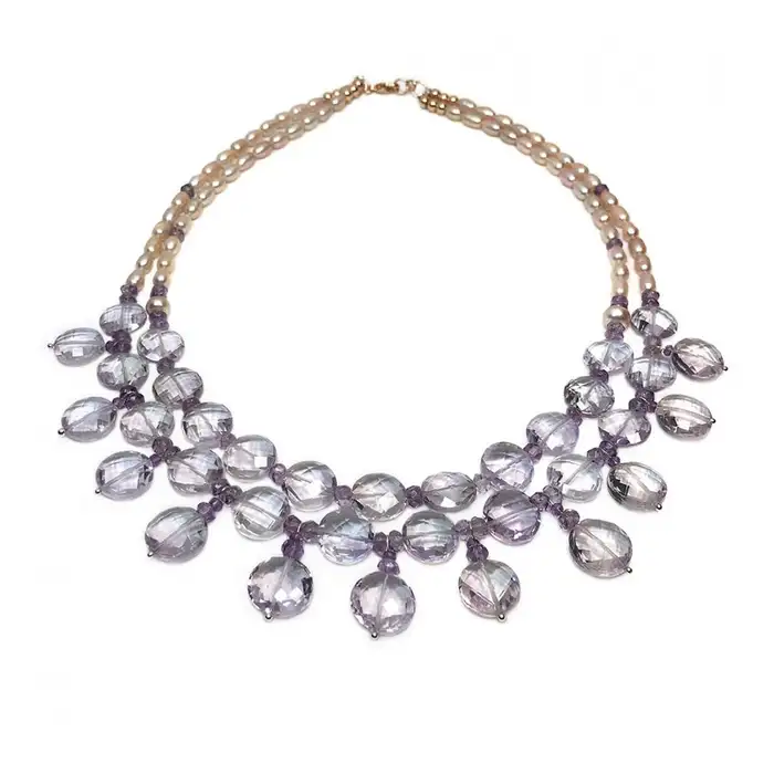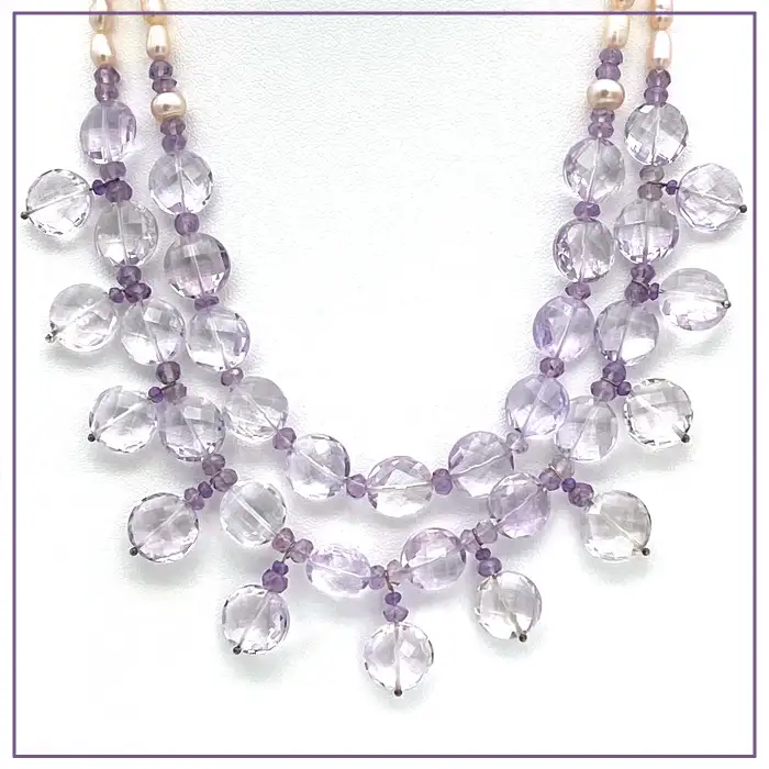 This is a double strand necklace we created with 13-14 mm faceted translucent pink amethyst coin shaped beads, 2-5 mm faceted amethyst round beads and pink-peach tone freshwater rice pearls, plus 14K rose gold filled components and a lobster clasp with a 3/4″ tail. Our vintage jewelry collection and original creations are all unique listings. We never have multiple copies of anything. So, if you miss the current opportunity you may not get another chance to own the piece you love. It usually takes us one day to ship out orders excepting weekends. We have 20 years of online business and shipping experience. We have quite different inventory for our physical store and online listings, so you are welcome to stop by to browse a lot more jewelry when you are in Atlanta.
