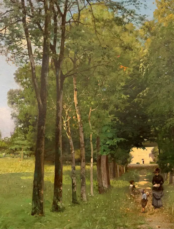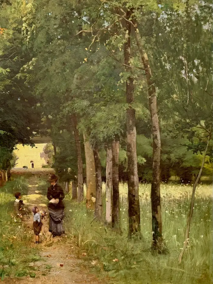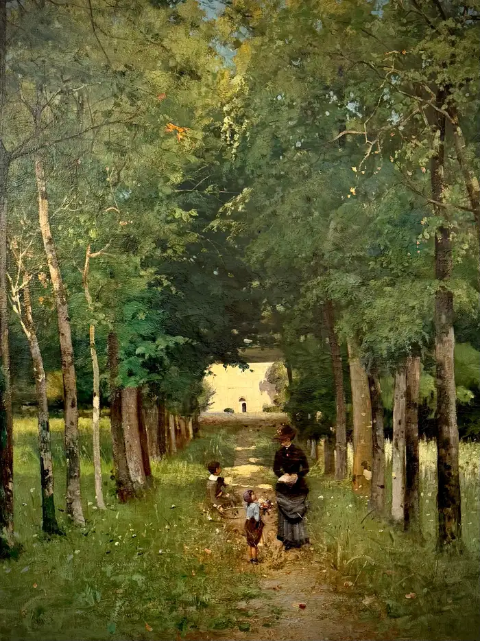 Alfred Smith Bordeaux 1854 – 1936 Paris French Painter ‘Mother with Children on a Wooded Path in Bordeaux’ Signature: signed lower left and dated 1883 ‘Alf Smith 83’ Medium: oil on canvas Dimensions: image size 98 x 122 cm, frame size 118 x 142 cm