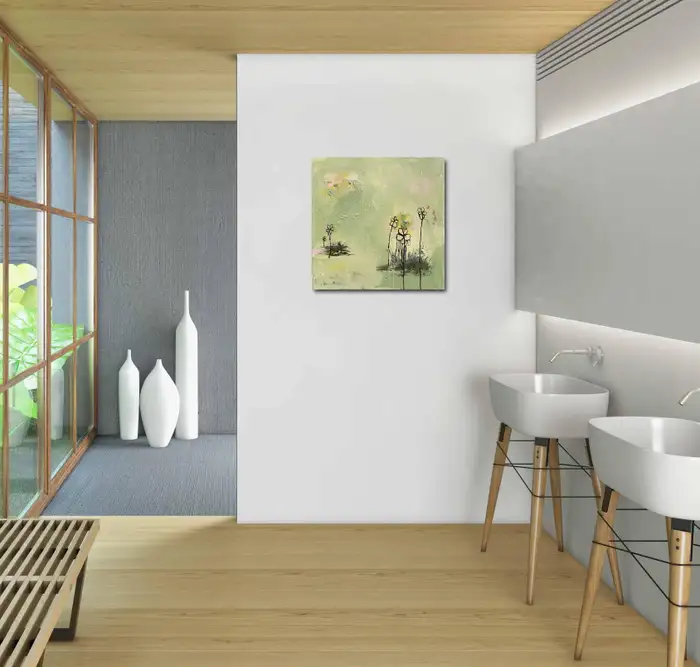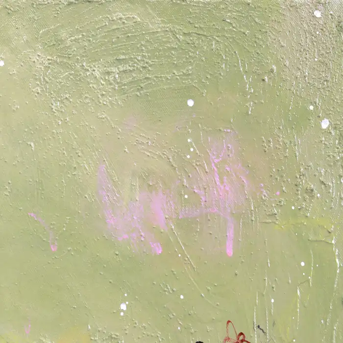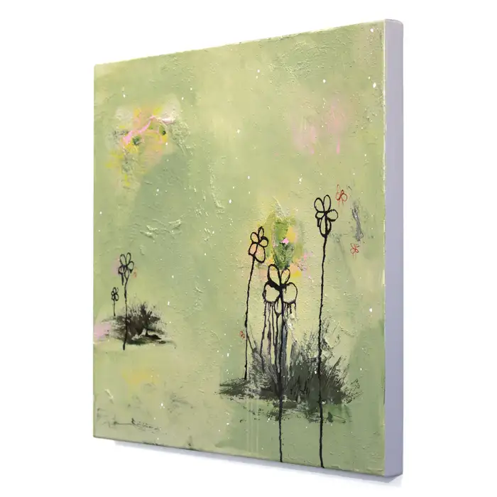 Los Angeles artist Amber Goldhammer paints dramatic abstract compositions in acrylic on canvas featuring energetic brushstrokes. Goldhammer uses her contemporary paintings to express emotions akin to silent poetry while drawing inspiration for her palette from the layered world around her. Her artworks include layered textures and playful details along the surfaces. She repeatedly uses words that come together to form a harmonious composition. • One-of-a-kind original graffiti-inspired abstract floral painting measuring 24 inches square