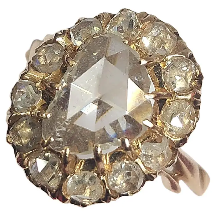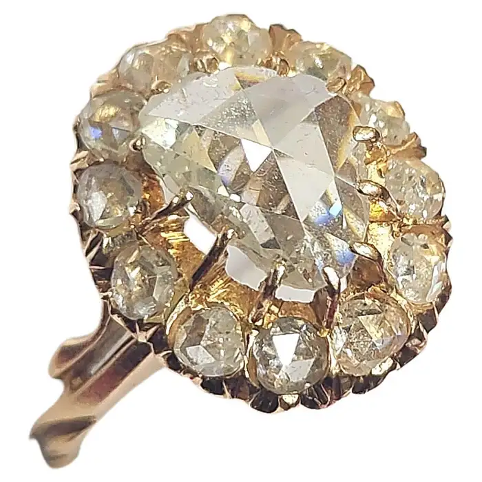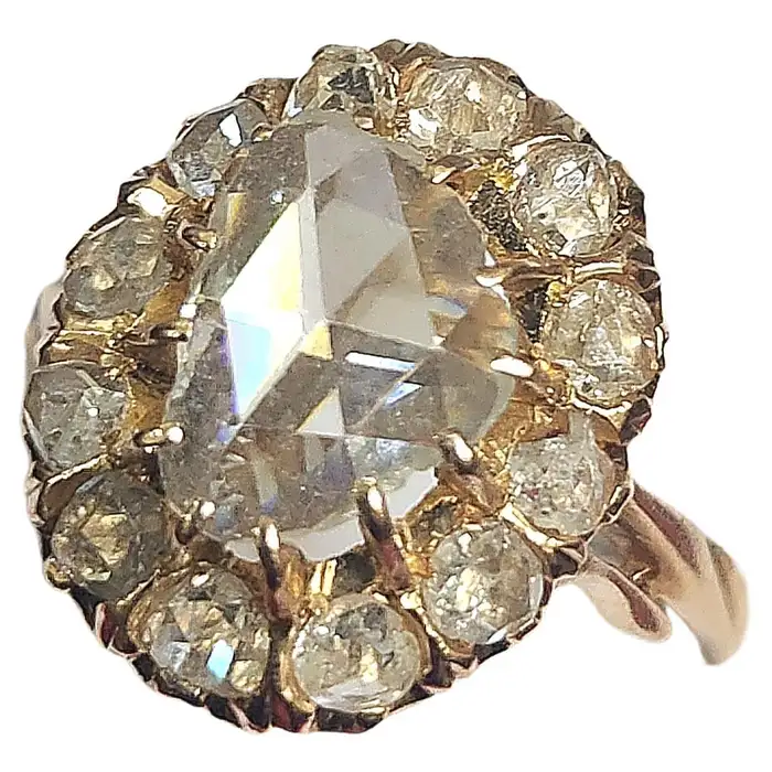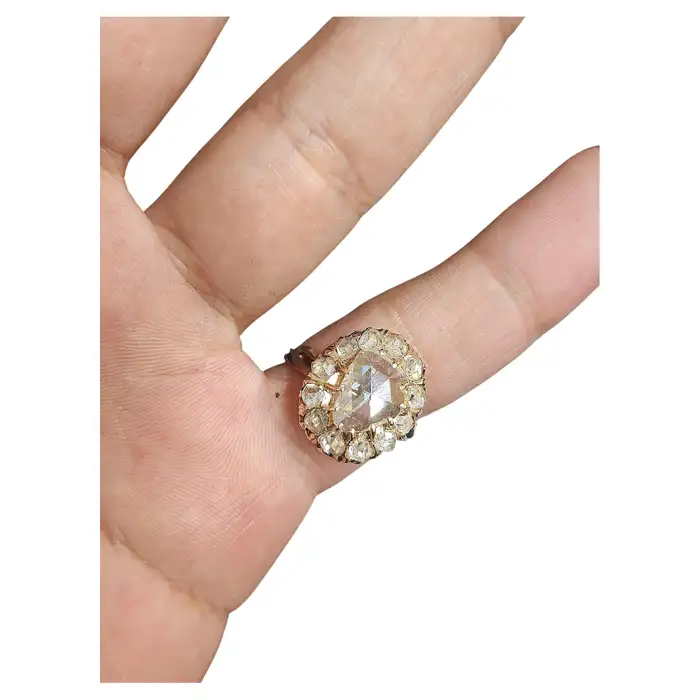 Large rose cut diamond diameter 10mm×8mm in octagon shape excellent spark white color no inclousion with total estimate diamond weight of 3.5 carats centered in 14k gold solitaire ring style flanked with smaller rose cut diamonds un foiled back