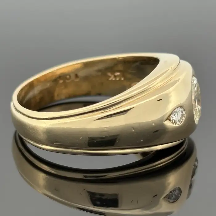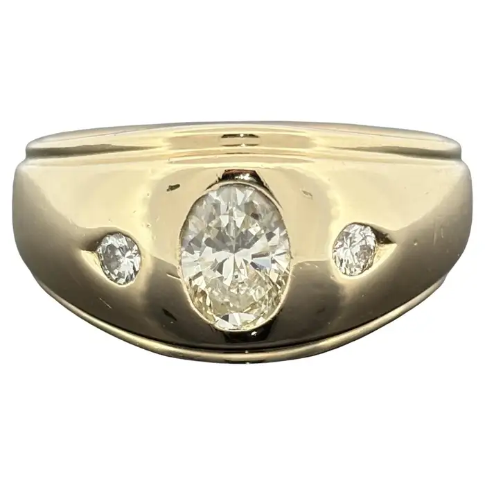A bold and timeless design with a refined, sculptural profile, this substantial 14K yellow gold ring centers around a classic three-stone diamond arrangement. The smooth, high-polish gold shoulders frame the diamonds beautifully, giving the ring a confident presence on the hand while maintaining an elegant, understated look. Specifications Metal: 14K yellow gold Weight: 11.8 grams